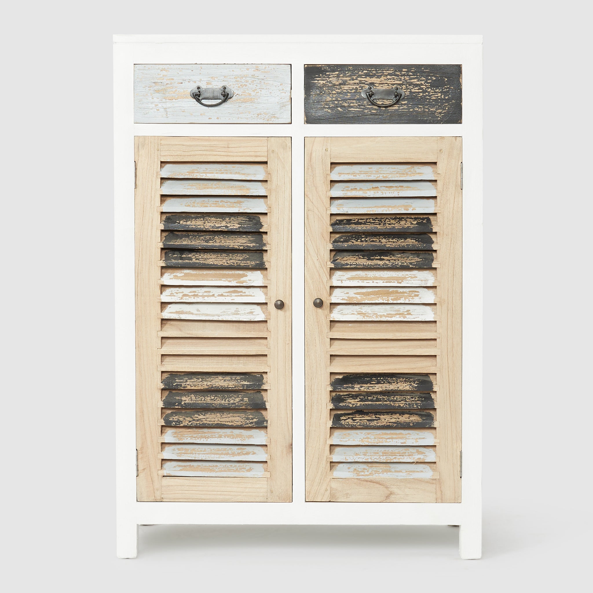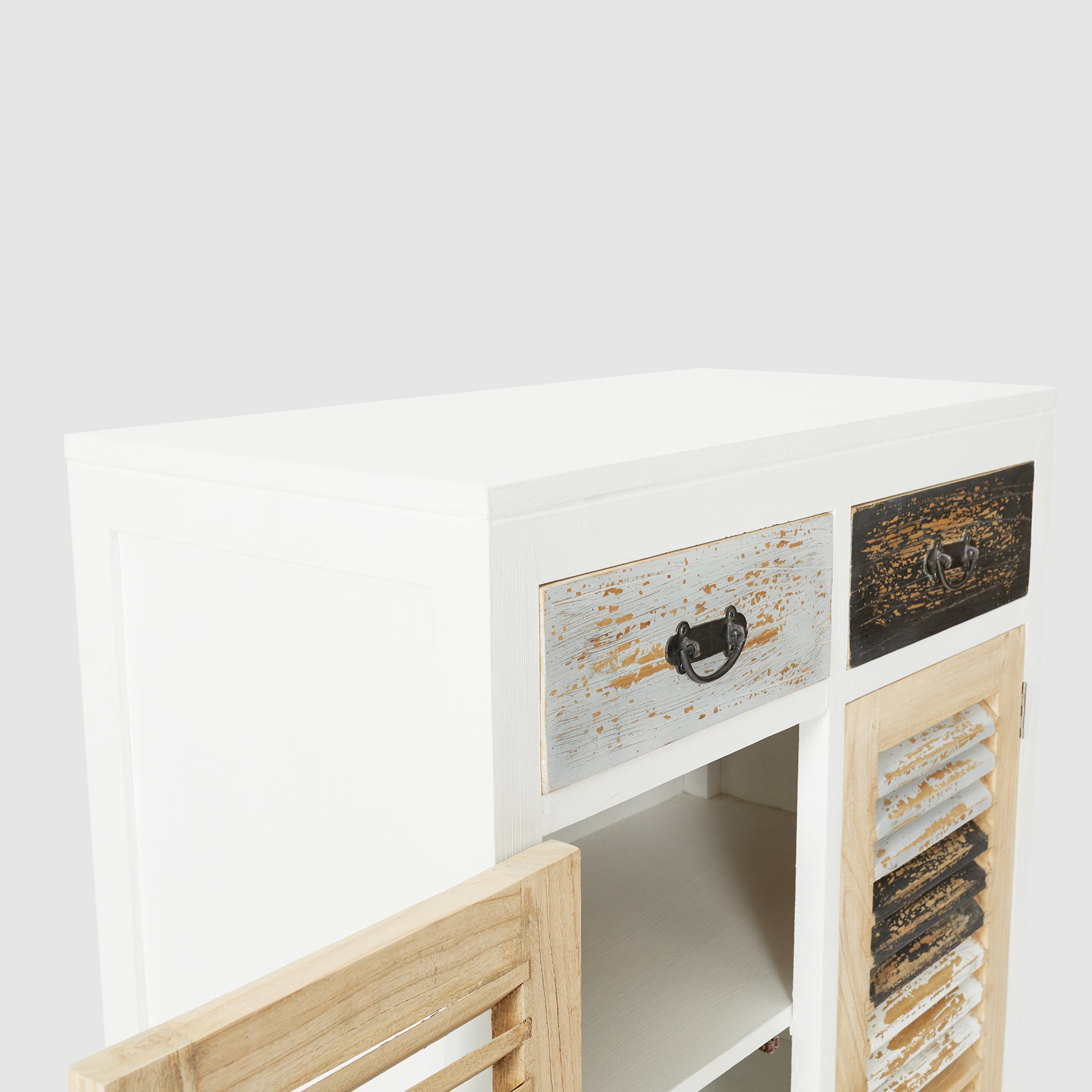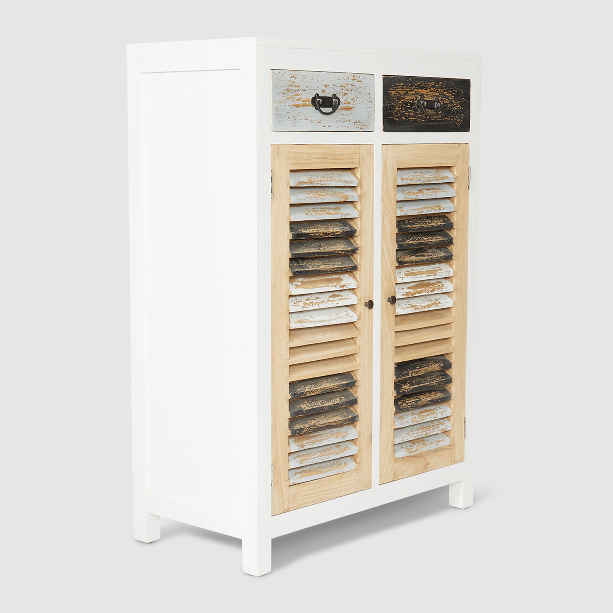The Augusta Cabinet offers a perfect blend of shabby chic style and practical storage. Handcrafted from solid mindi wood, this piece features two beautifully distressed drawers and rustic louvered doors with unique weathered finishes. Each detail adds a touch of character, making this cabinet a true statement piece for your home. The contrasting white frame and natural wood elements evoke a charming vintage appeal. Whether used in a bedroom, hallway, or living space, the Augusta Cabinet brings both function and shabby chic elegance to any room.