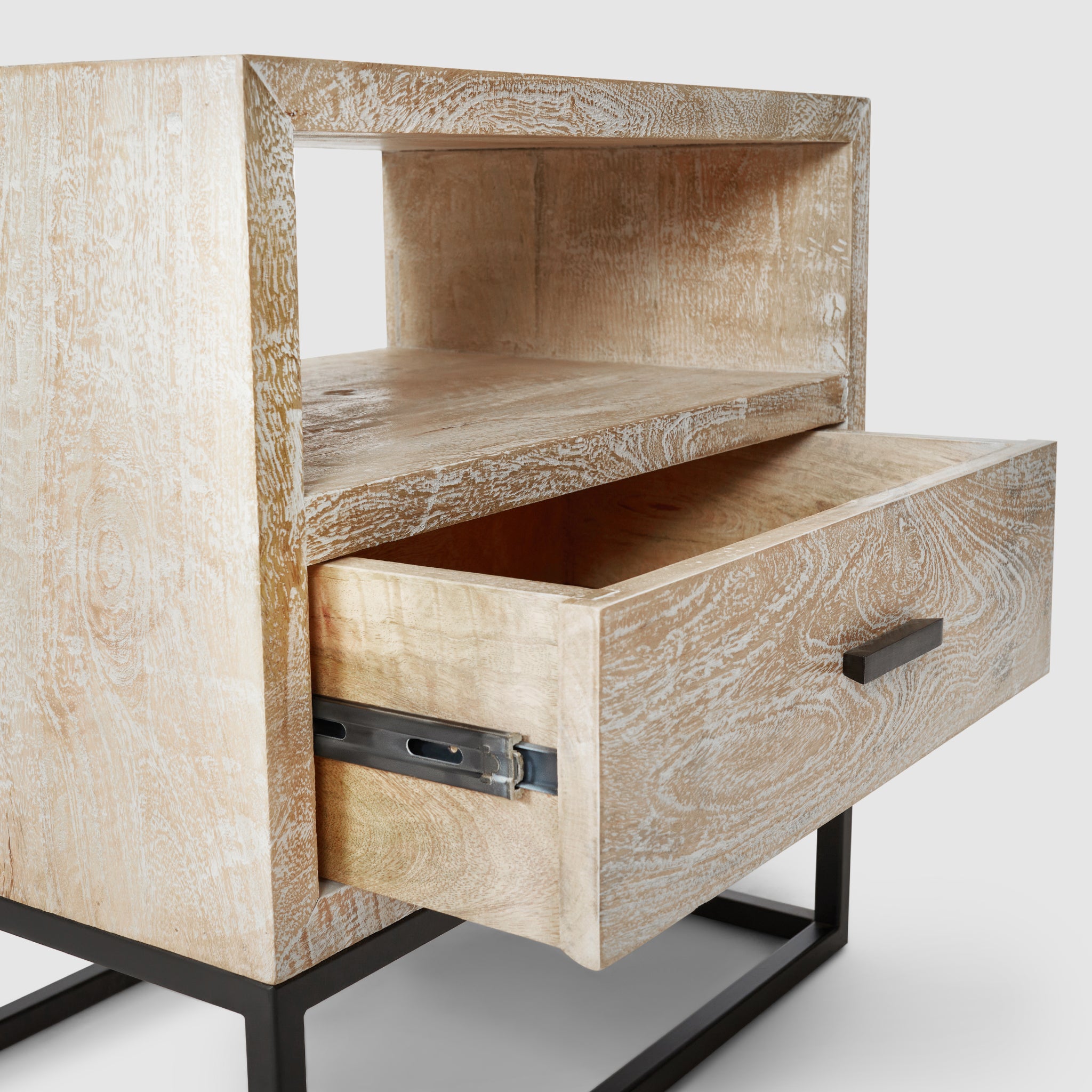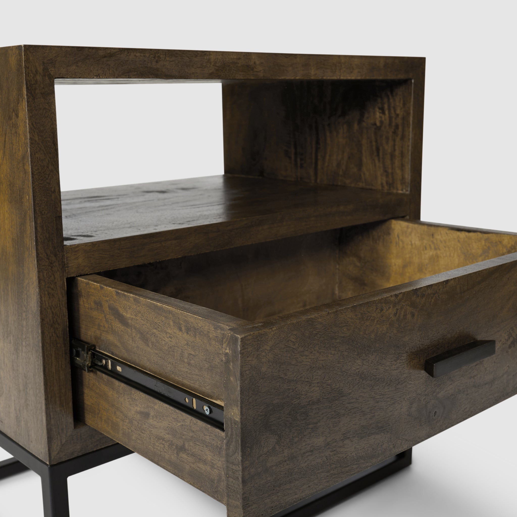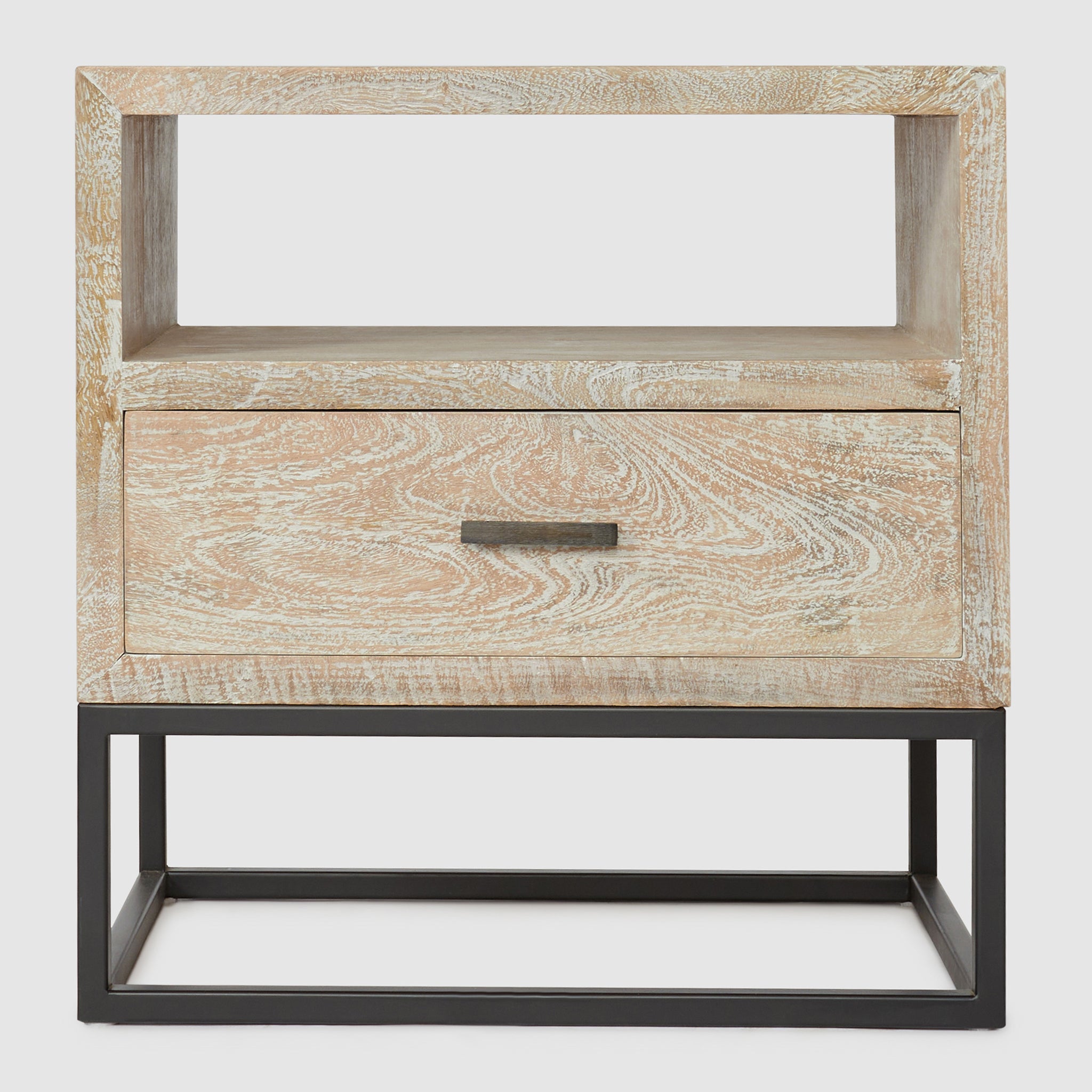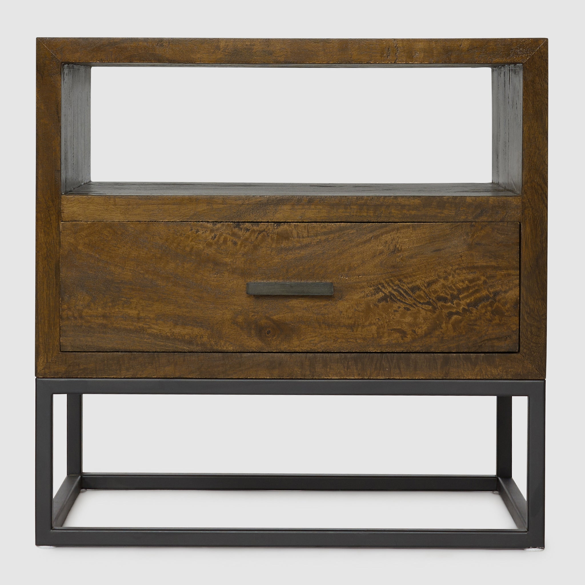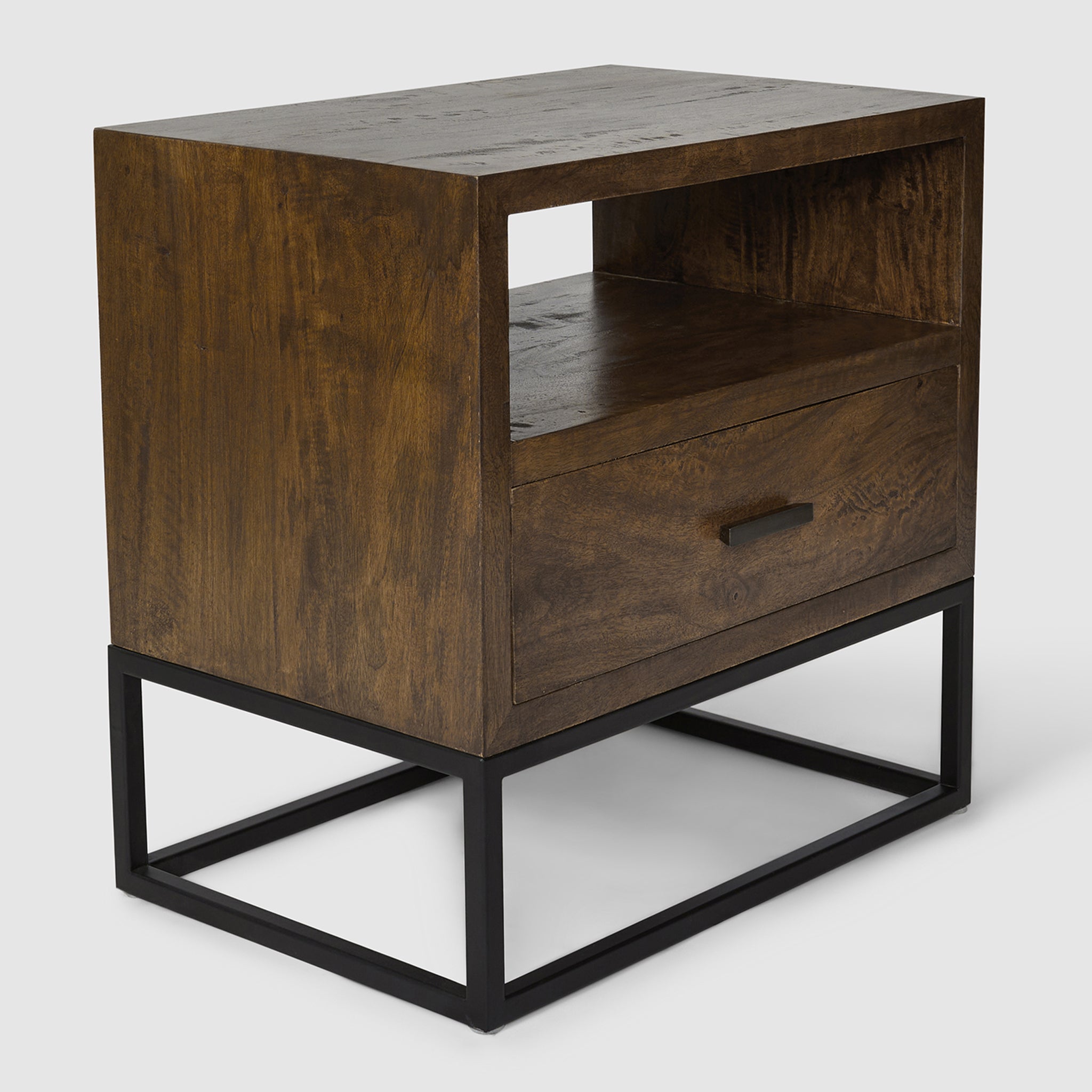 The compact Dakota Bedside Table offers the same stunning craftsmanship in a smaller footprint. Made from solid mango wood, it features a natural textured finish that highlights the individuality of each piece. The sturdy black metal frame enhances its modern aesthetic, while the open shelf and drawer provide just the right amount of storage for your nighttime necessities. Perfect for smaller bedrooms, the Dakota Bedside Table combines rustic warmth with a sleek, industrial style, bringing both character and functionality to your space.