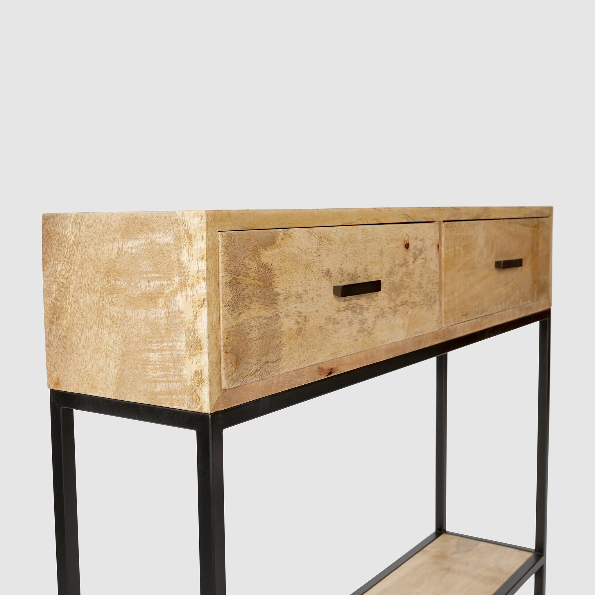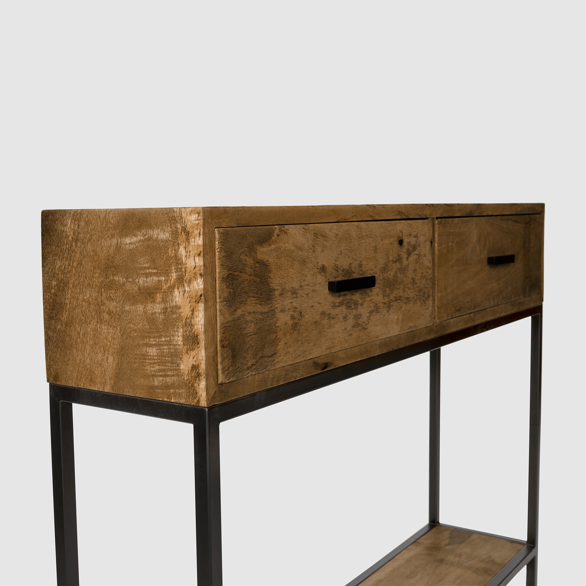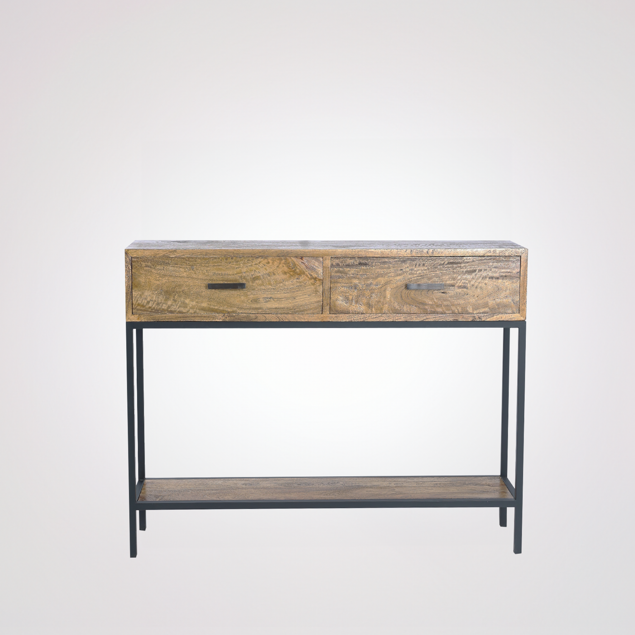 Introducing the Haveli Console, where the rich character of solid mango wood finds a perfect counterpoint in a sleek black metal frame. Equipped with two thoughtfully designed drawers, the Haveli provides both a touch of elegance and practical storage. Each grain of its wooden expanse speaks of nature's intricate artistry, while the contemporary metal frame lends a touch of modern sophistication. The Haveli Console is more than a furnishing—it stands as a symbol of sustainable luxury and masterful design, seamlessly blending function and flair to enhance any room.