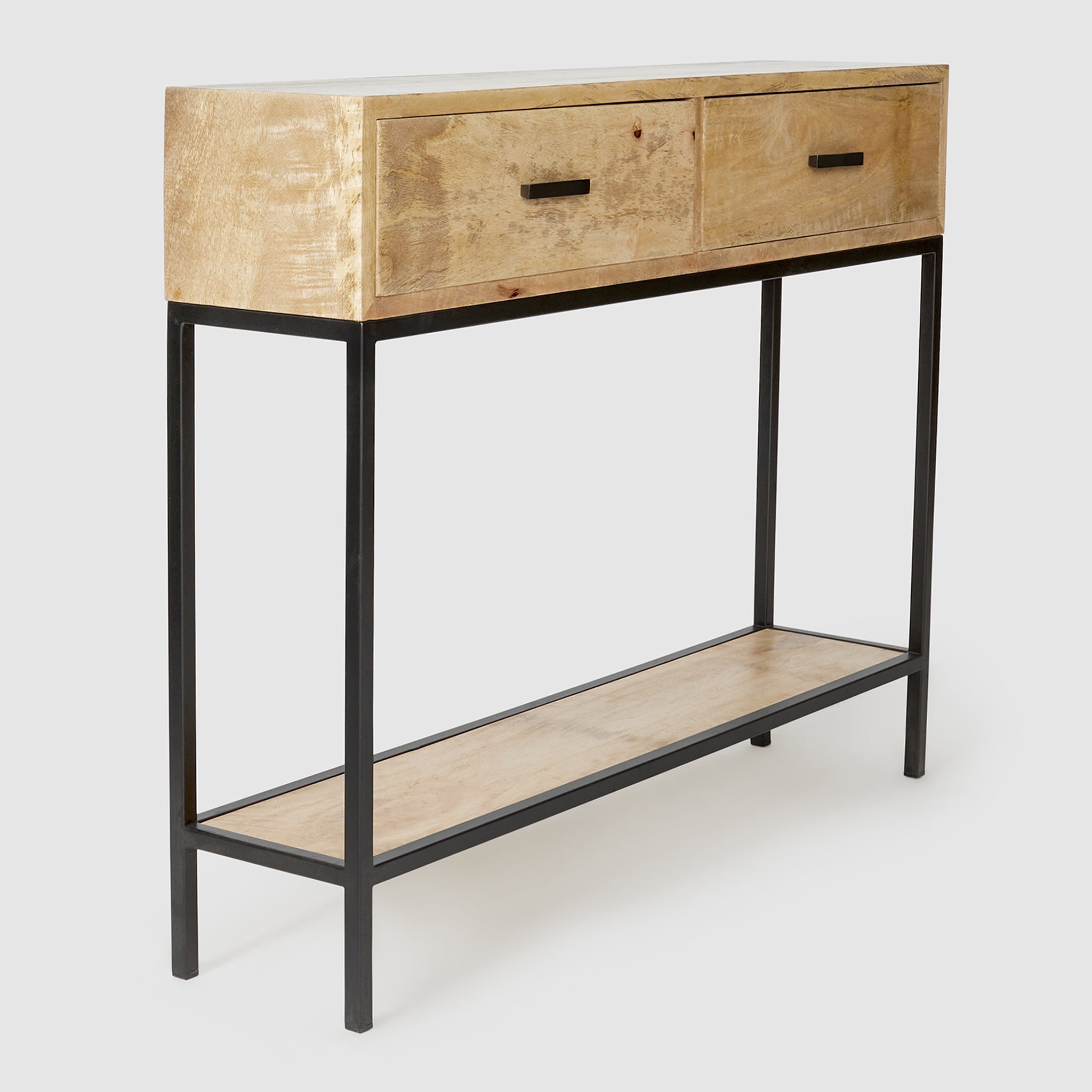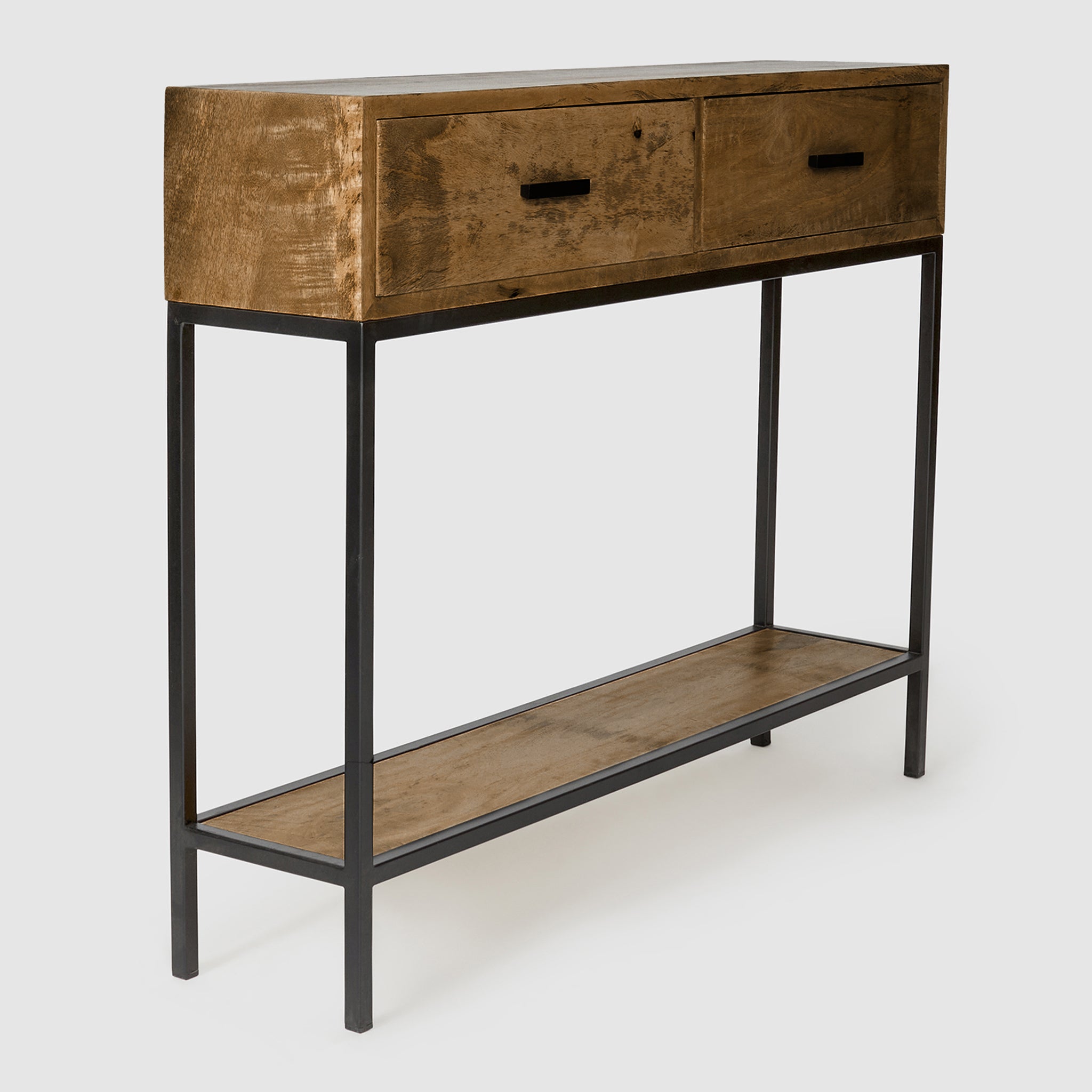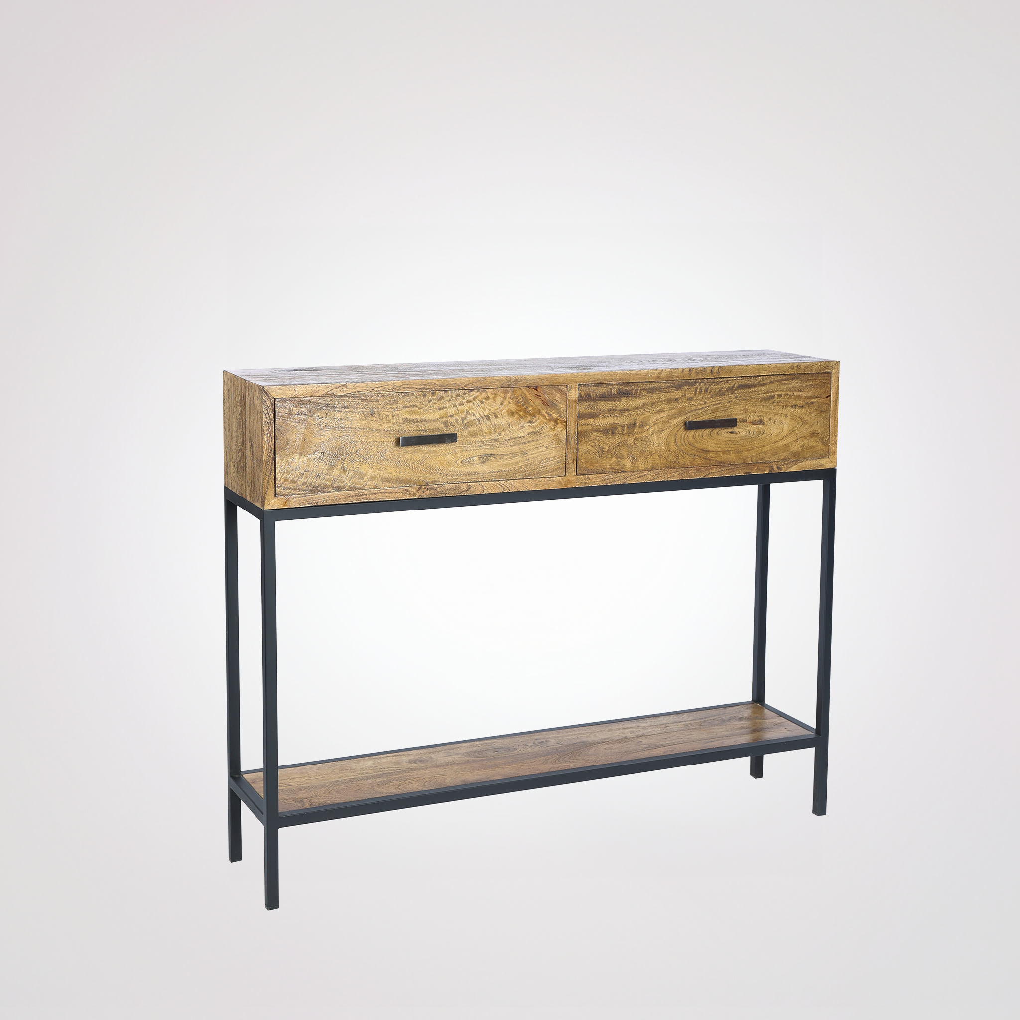 Introducing the Haveli Console, where the rich character of solid mango wood finds a perfect counterpoint in a sleek black metal frame. Equipped with two thoughtfully designed drawers, the Haveli provides both a touch of elegance and practical storage. Each grain of its wooden expanse speaks of nature's intricate artistry, while the contemporary metal frame lends a touch of modern sophistication. The Haveli Console is more than a furnishing—it stands as a symbol of sustainable luxury and masterful design, seamlessly blending function and flair to enhance any room.