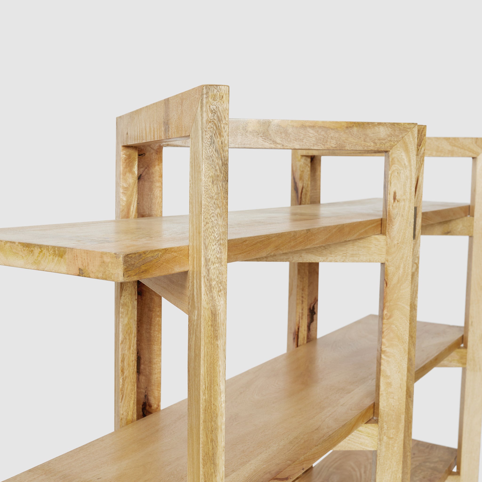 Introducing the Luminara bookcase, a seamless union of form and function. Crafted from solid mango wood, this piece boasts a robust wooden frame that supports three spacious shelves. The Luminara not only provides ample space for your literary treasures but also showcases the unique narratives and intricate patterns of the wood's grain. More than just a storage solution, the Luminara is a testament to sustainable elegance and fine craftsmanship, poised to illuminate and elevate any room with its presence.