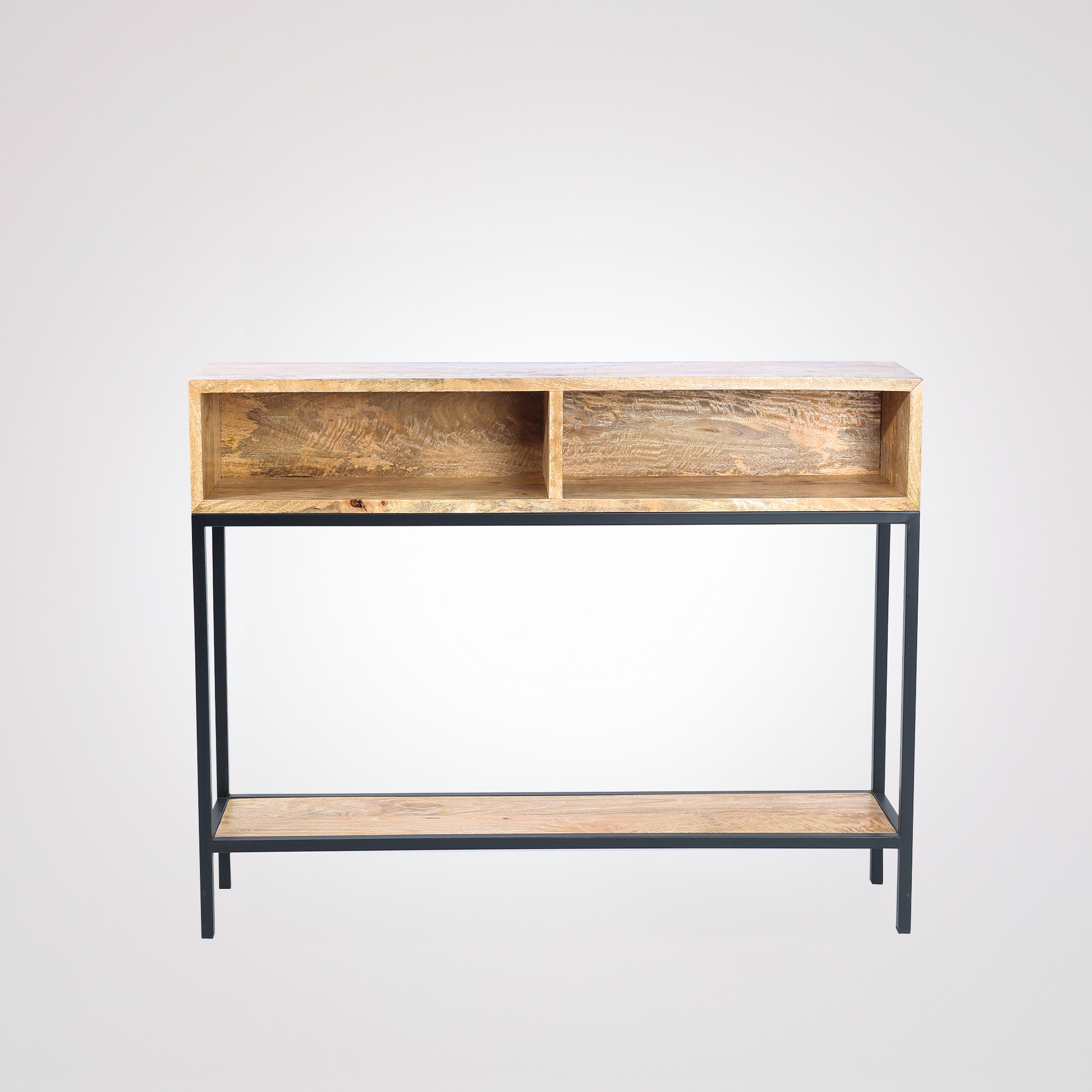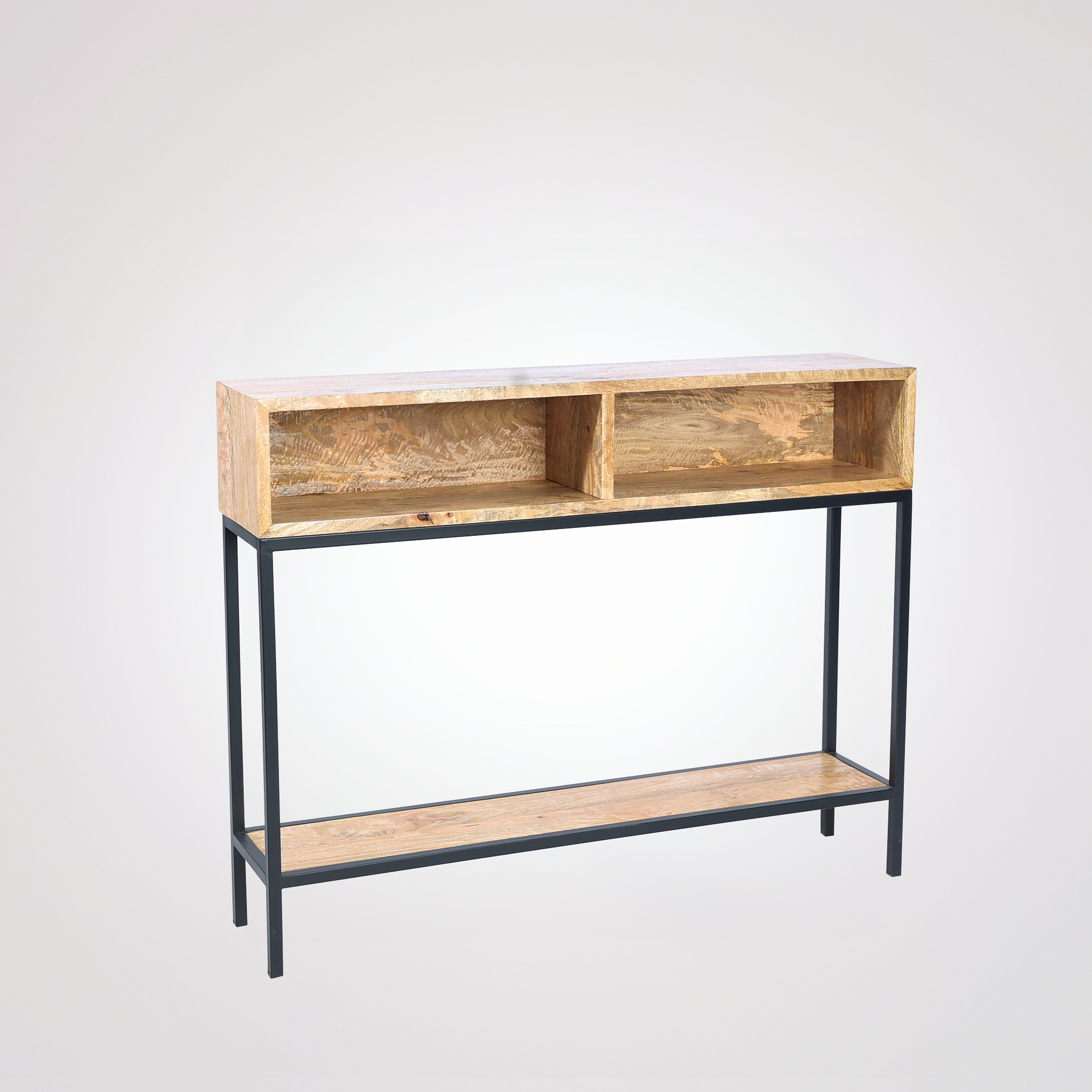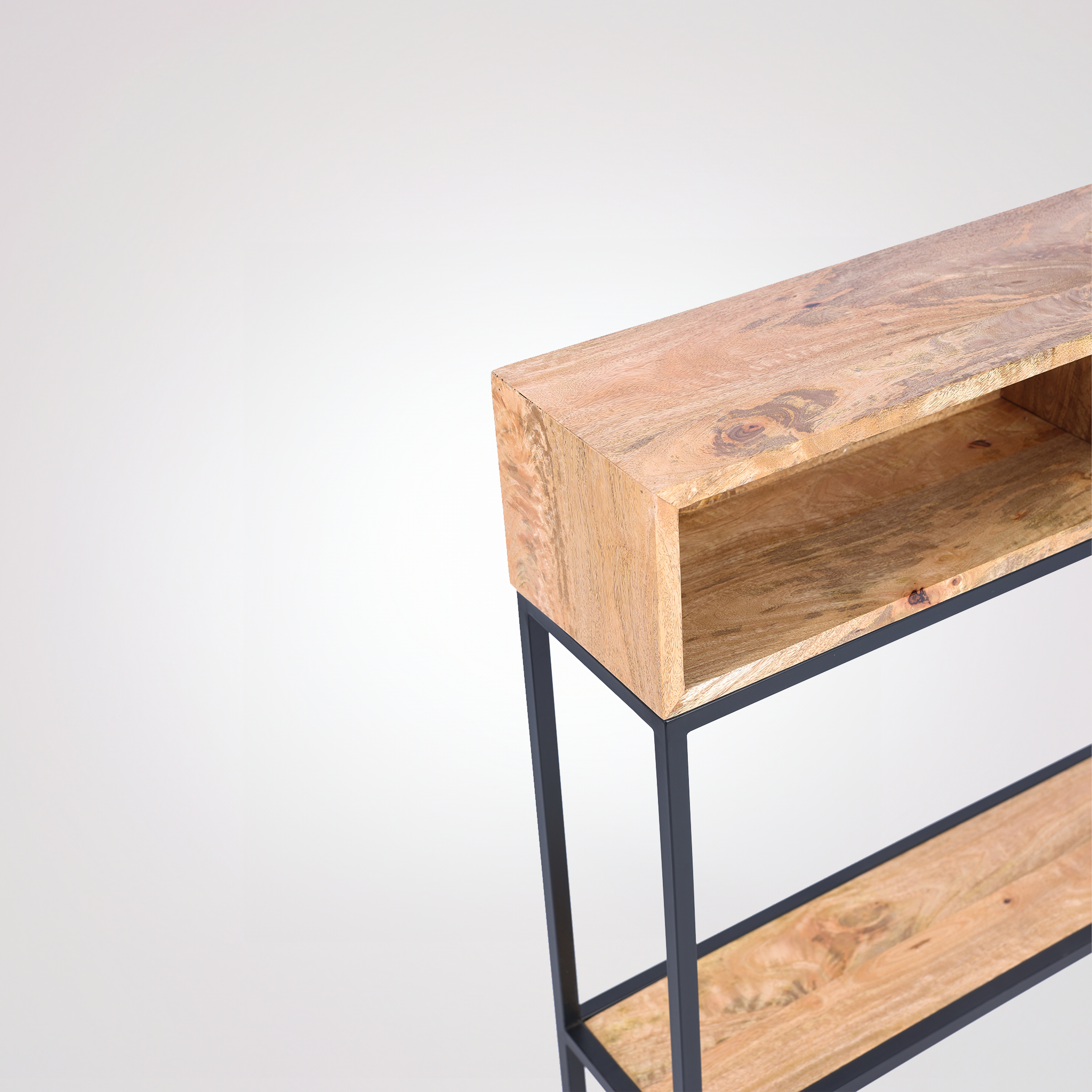 Introducing the Lunastra Console, a harmonious blend of solid mango wood's natural warmth and the sleek, modern touch of black metal legs. The Lunastra, with its two open shelves, offers an elegant canvas to showcase and store your cherished items. Every inch of its wooden surface narrates a unique tale of nature's handiwork, complemented beautifully by the contemporary metal supports. The Lunastra Console isn't just a piece of furniture—it's a celebration of sustainable luxury and design finesse, seamlessly fitting into and elevating any space it occupies.