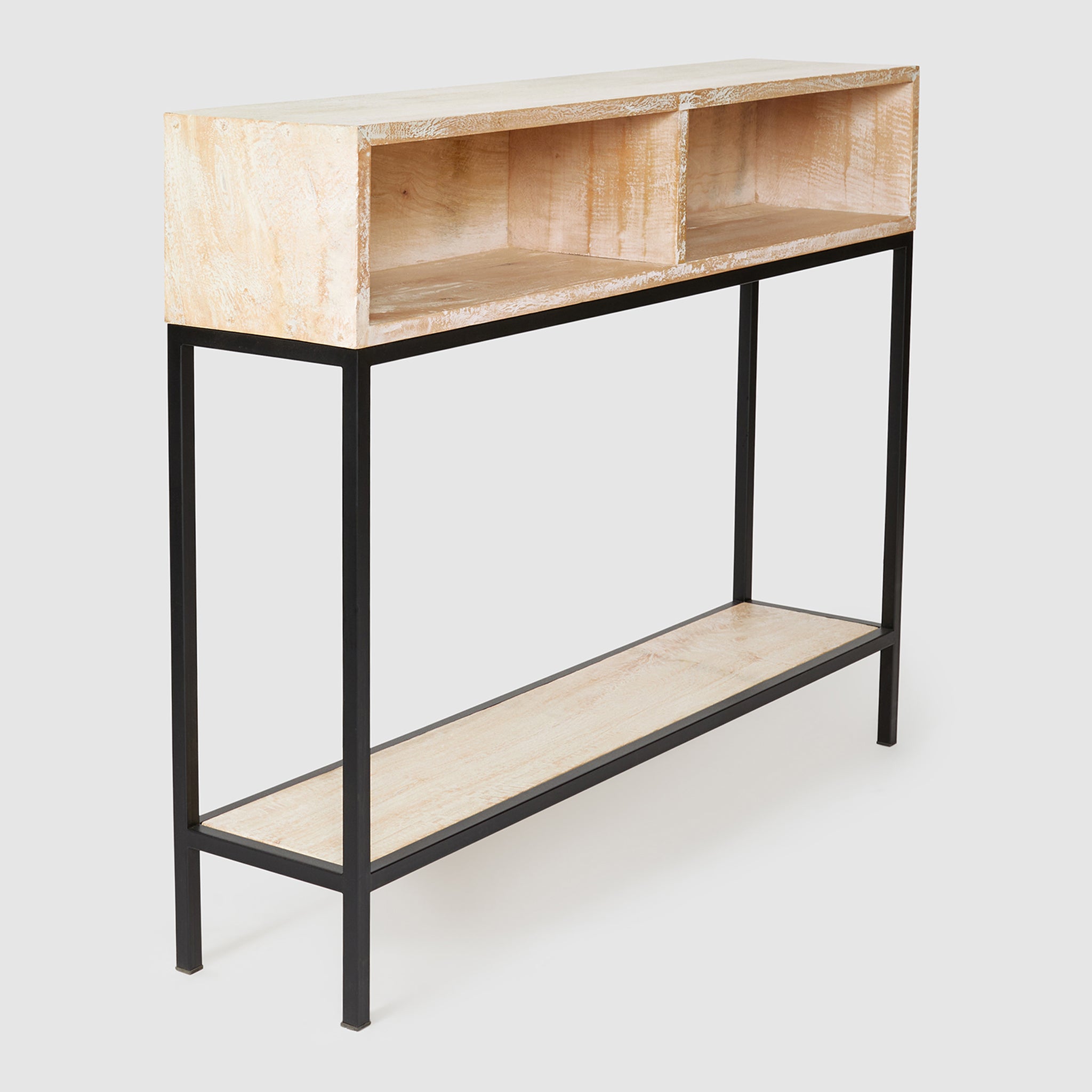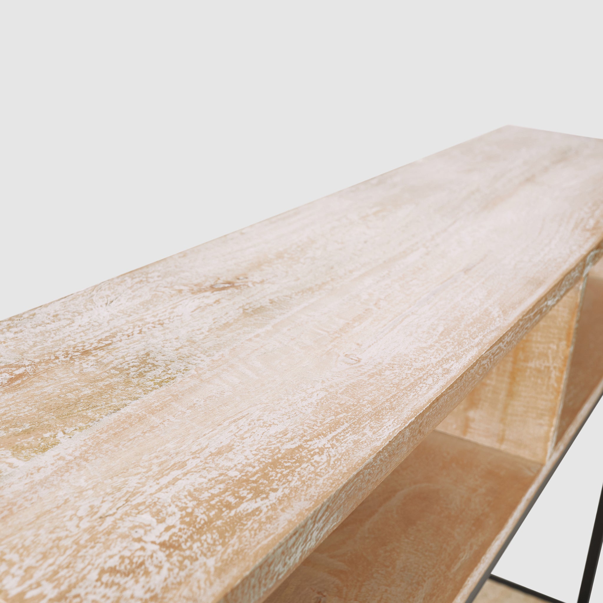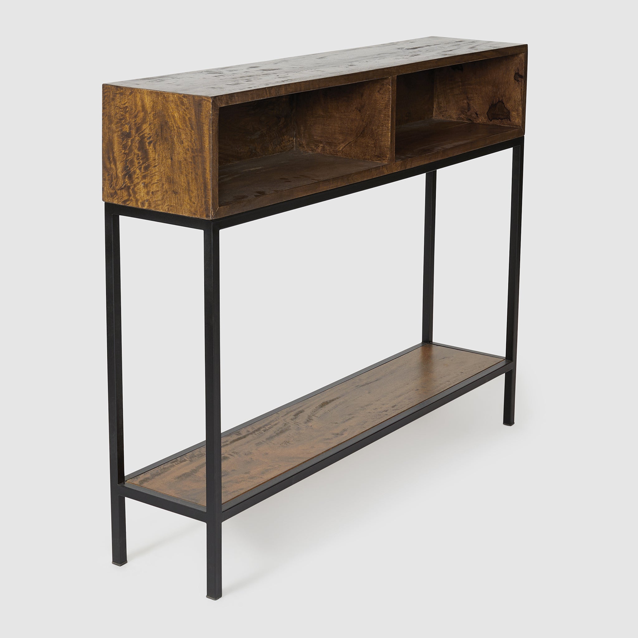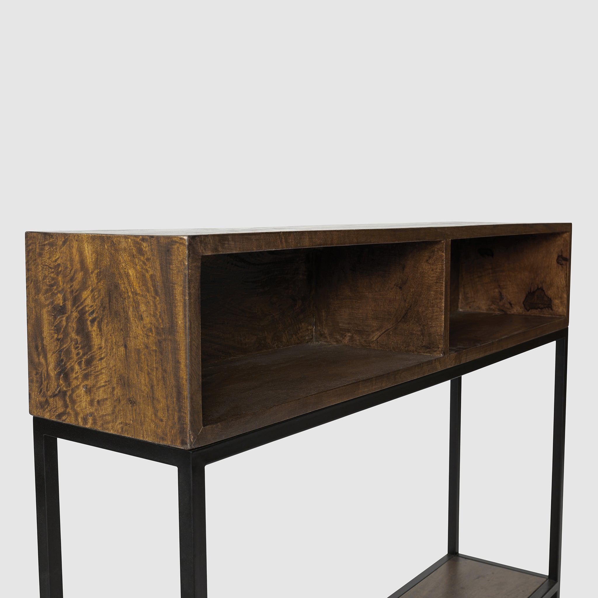 Introducing the Lunastra Console, a harmonious blend of solid mango wood's natural warmth and the sleek, modern touch of black metal legs. The Lunastra, with its two open shelves, offers an elegant canvas to showcase and store your cherished items. Every inch of its wooden surface narrates a unique tale of nature's handiwork, complemented beautifully by the contemporary metal supports. The Lunastra Console isn't just a piece of furniture—it's a celebration of sustainable luxury and design finesse, seamlessly fitting into and elevating any space it occupies.