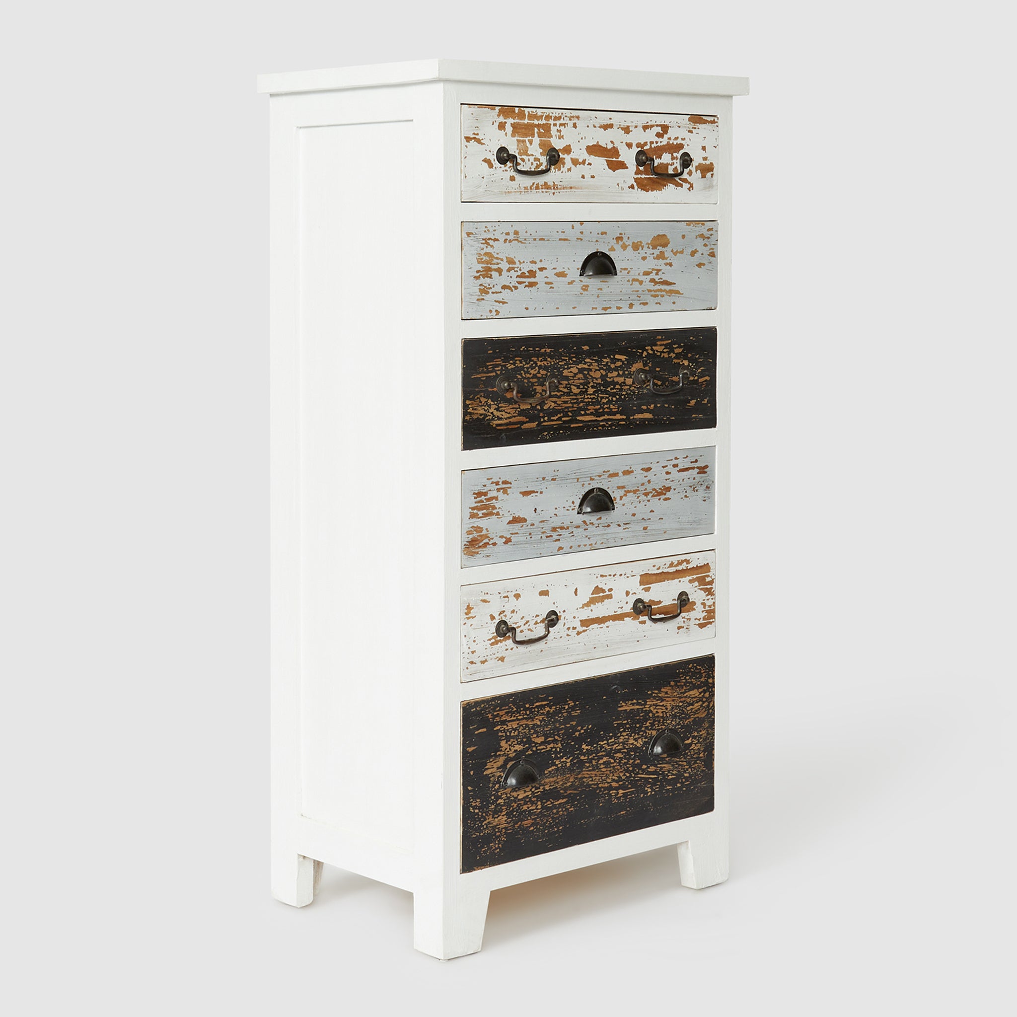 The Savannah Tallboy combines shabby chic elegance with functional storage, offering six spacious drawers for your essentials. Handcrafted from solid mindi wood, this tallboy features beautifully distressed drawer fronts, each with its own unique, weathered finish that adds character and vintage charm. The classic white frame contrasts perfectly with the rustic drawer designs, making the Savannah a standout piece in any room. Perfect for adding both style and practicality, this tallboy brings the timeless appeal of shabby chic decor into your home.