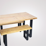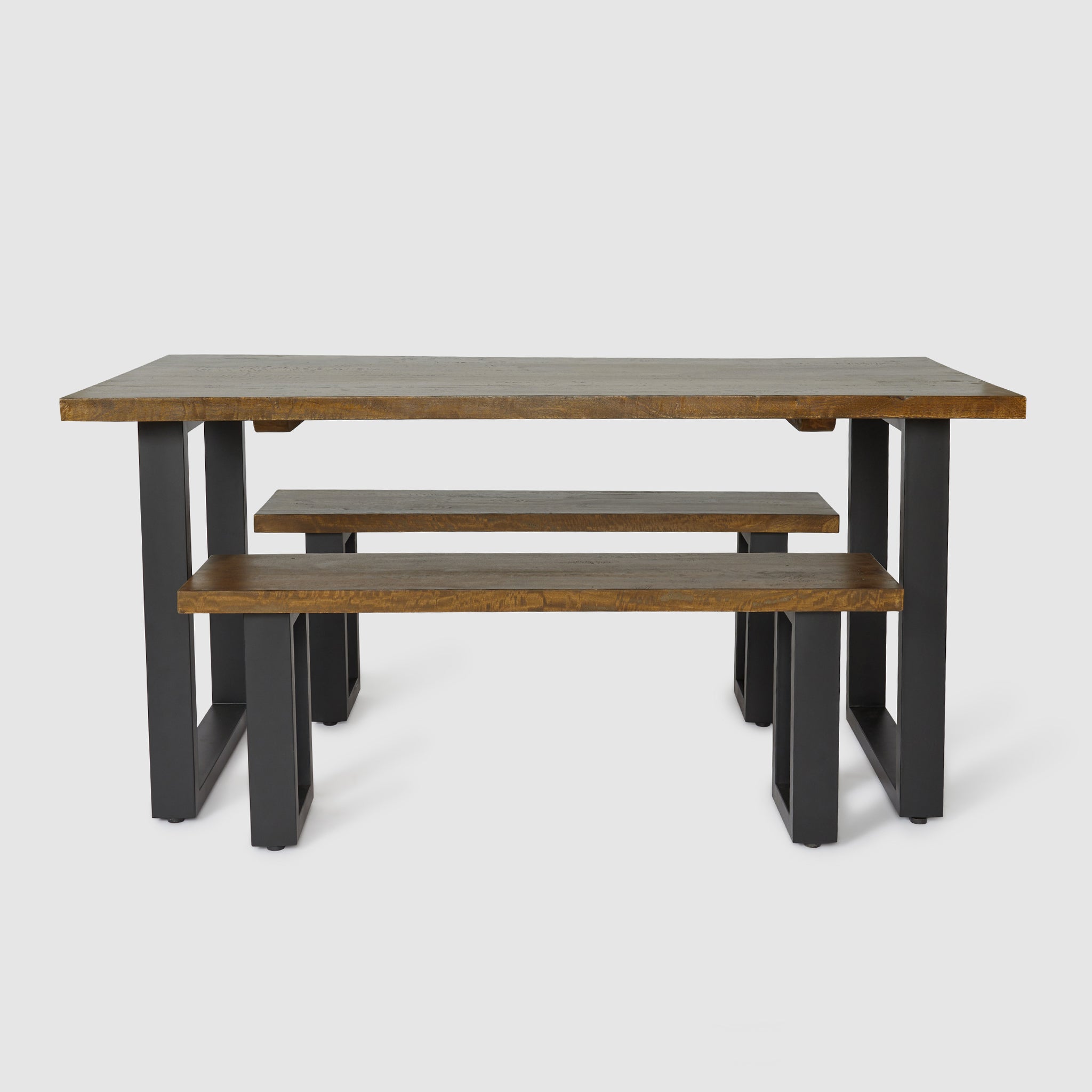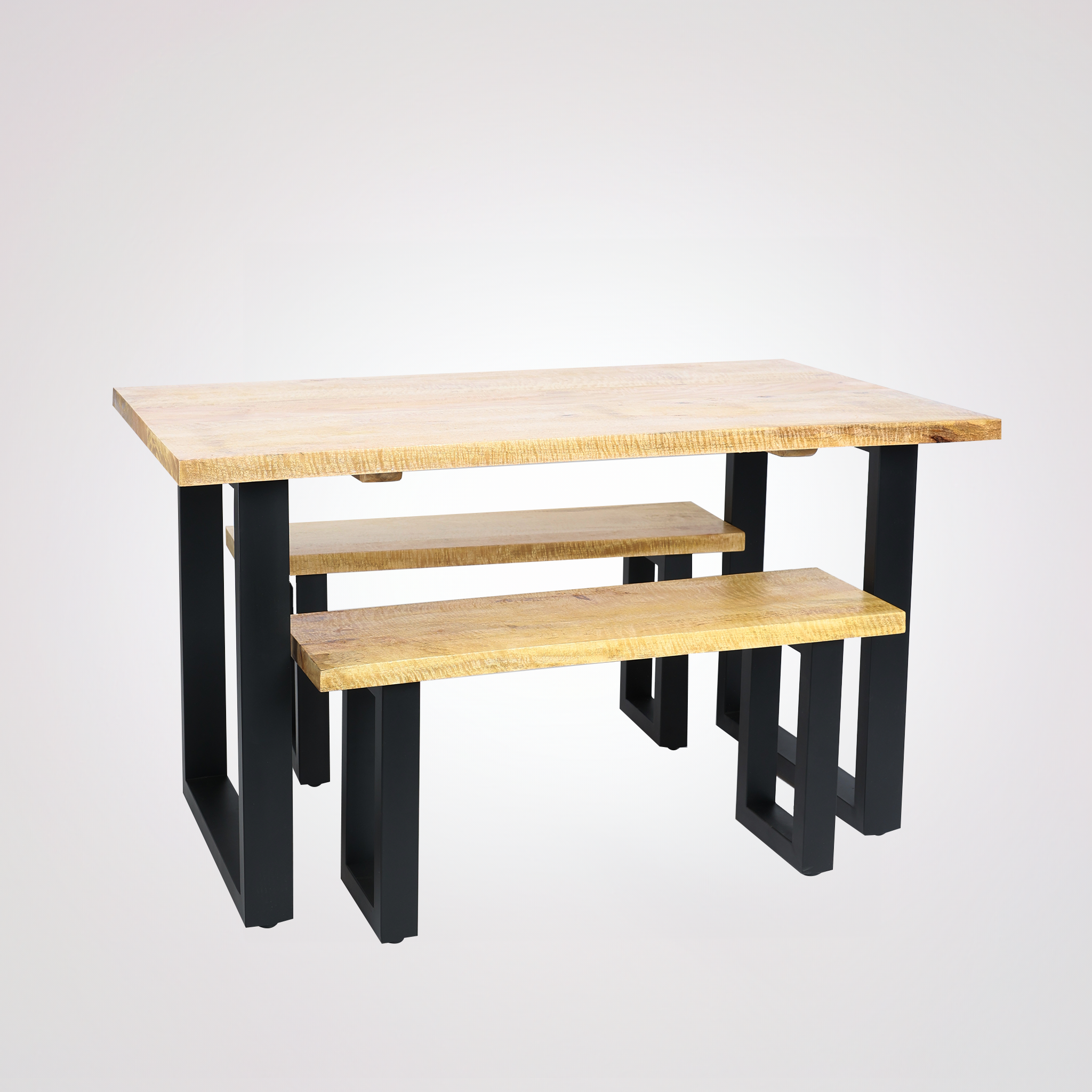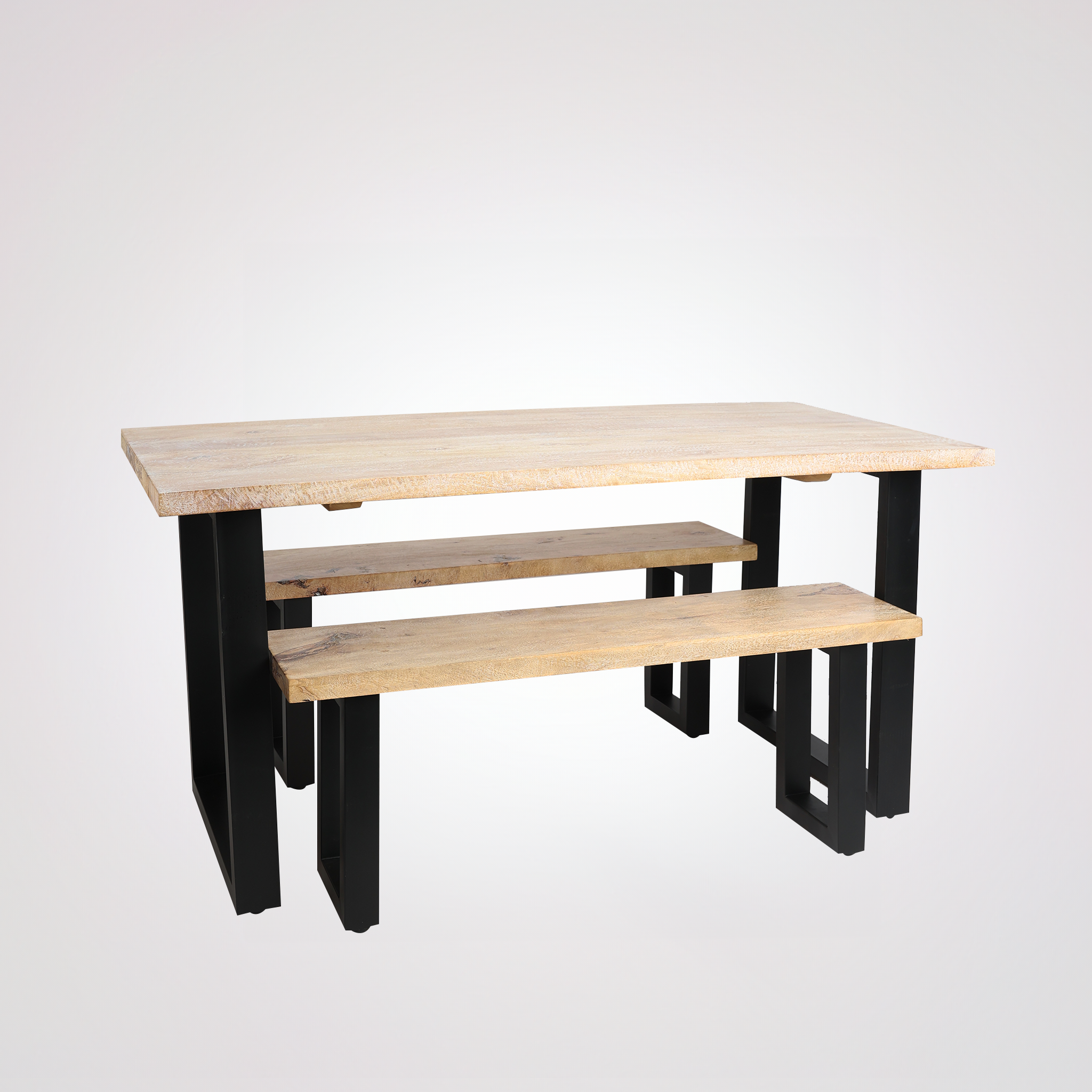 Introducing the Toros Dining Table, a stunning blend of solid mango wood and sleek black metal. Every inch of this table showcases the natural beauty of mango wood's grain, ensuring that each Toros piece is uniquely its own. Supported by bold black metal legs, the design seamlessly combines rustic warmth with industrial sophistication. The Toros Dining Table is more than just a gathering place—it's a testament to sustainable luxury and modern craftsmanship, embodying nature's refined elegance. To complete the experience, it comes with two matching benches, creating a harmonious and stylish dining set.