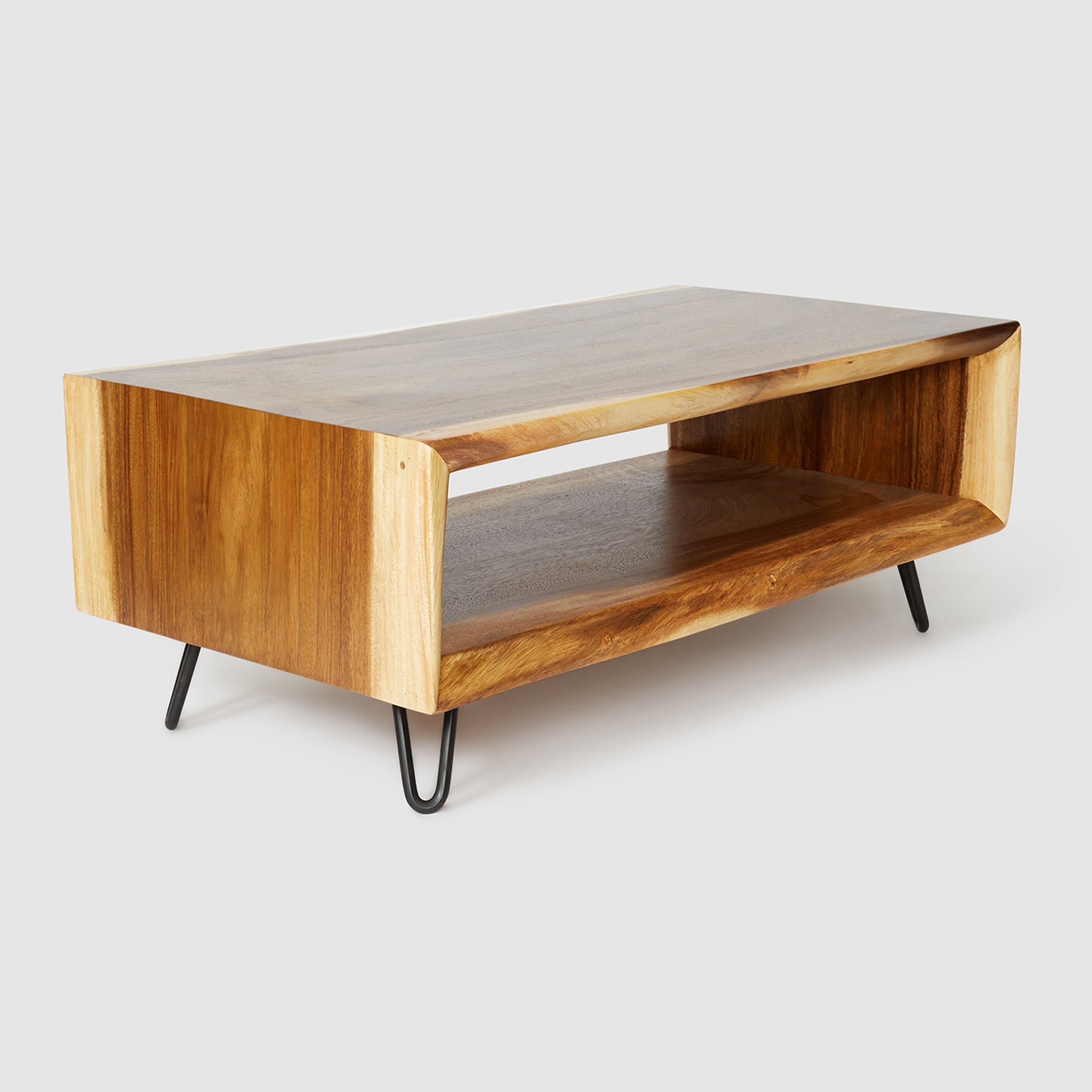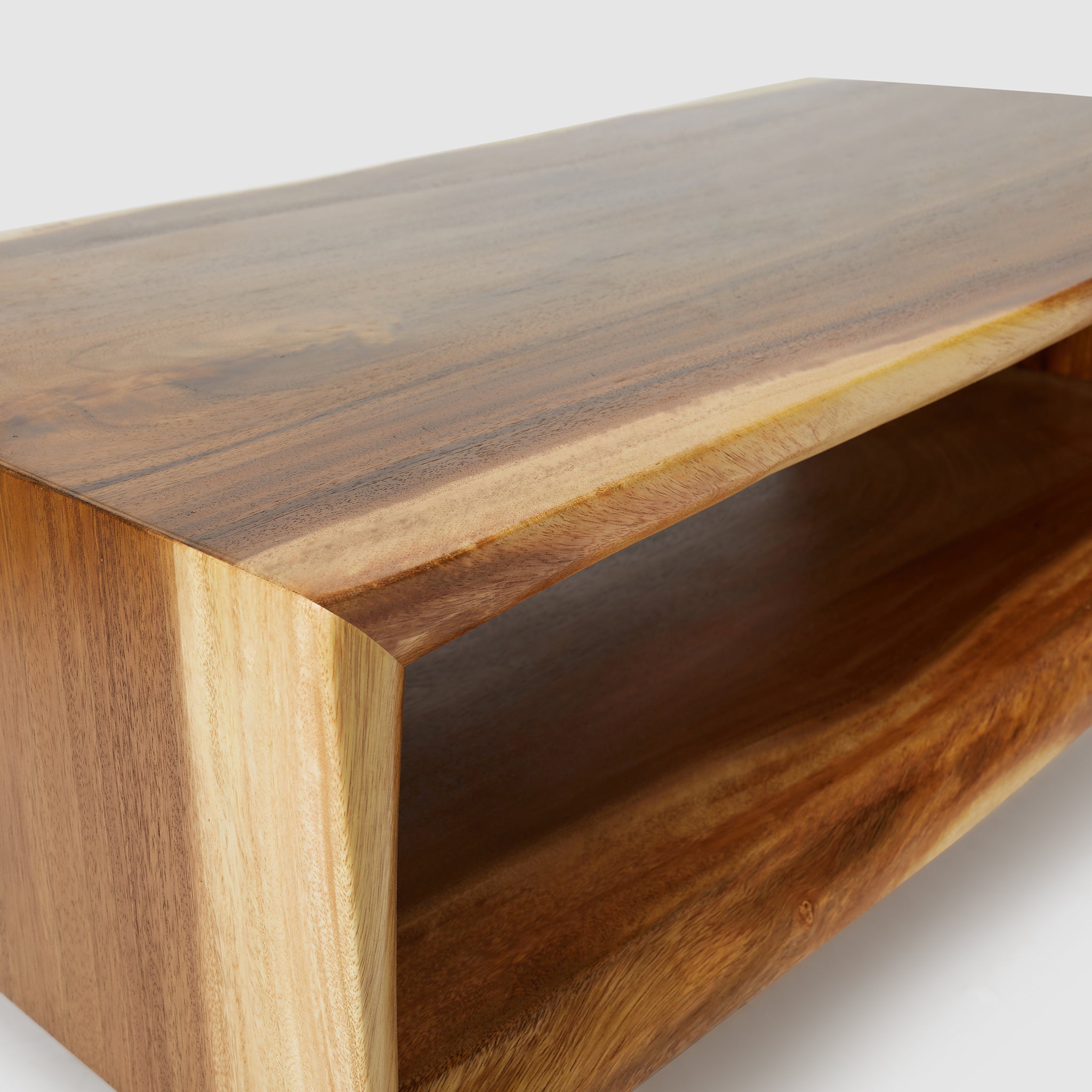 Introducing the Velare coffee table, a masterpiece where every edge pays homage to the untouched allure of solid suar wood. Embraced by the raw beauty of a live edge on every side, the Velare unfolds the intricate tales and patterns inherent in its wood, crafting a narrative that's uniquely its own. Beneath this captivating surface, an open expanse beckons, providing both aesthetic appeal and functional storage. The Velare is more than a piece of furniture; it stands as an ode to the harmonious dance between nature's wonders and artisanal design, awaiting its place in a discerning living space.